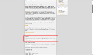 TOS 条款原文: "With the exception of SLA plans, we allow you to use 100% of the CPU resources on your VPS for short periods of time. However, one-hour-average CPU load on your VPS should not exceed the maximum level permitted..."