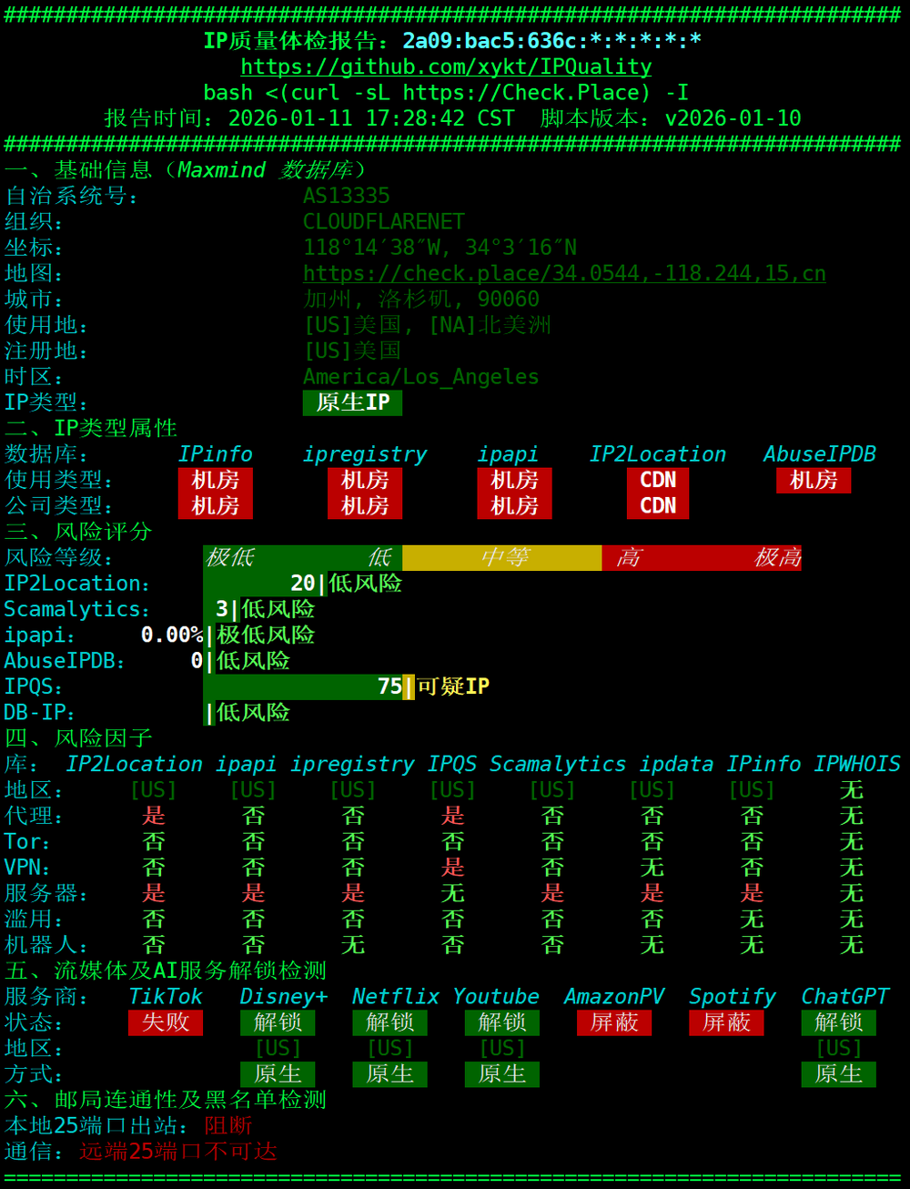 如果这个时候你想检验下一 WireProxy IP 地址的 IP 质量,用以下命令