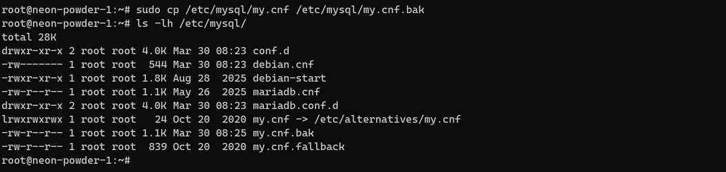 sudo cp /etc/mysql/my.cnf /etc/mysql/my.cnf.bak ls -lh /etc/mysql/