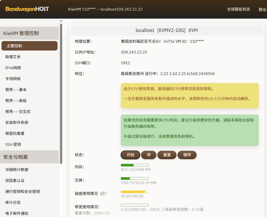如图所示,当 CPU 高占用持续达到一定时间后(具体规则可参考 [服务条款](https://bandwagonhost.com/kb.php?action=displayarticle&id=6)),系统可能会自动将 CPU 使用限制在 30% 左右。等你排除高占用进程后,大约 60–120 分钟后限速会自动解除。