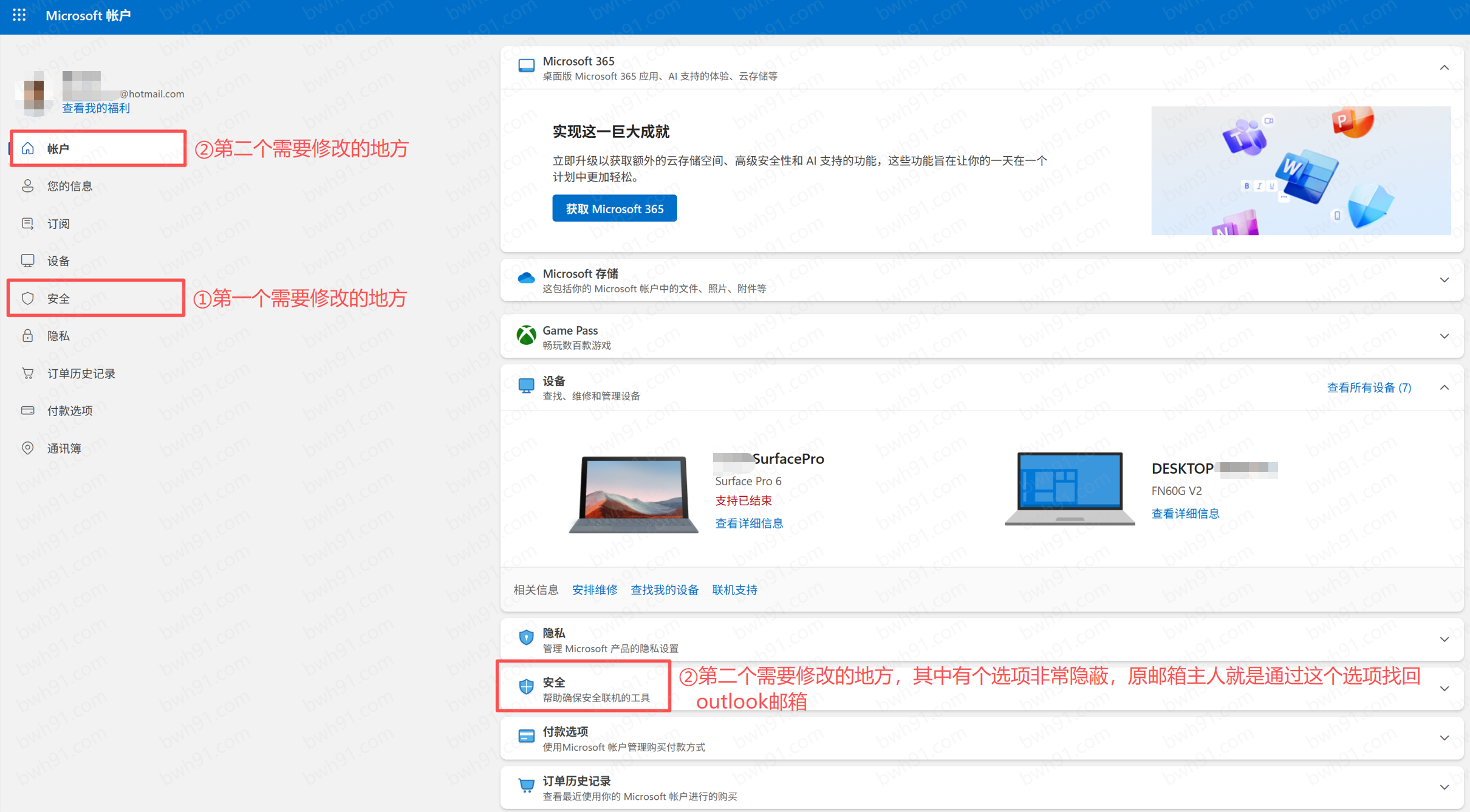 一、登录outlook安全中心:https://account.microsoft.com/security ,接着使用Outlook 邮箱账户登录,登录后如图所示(需要修改两个地方):