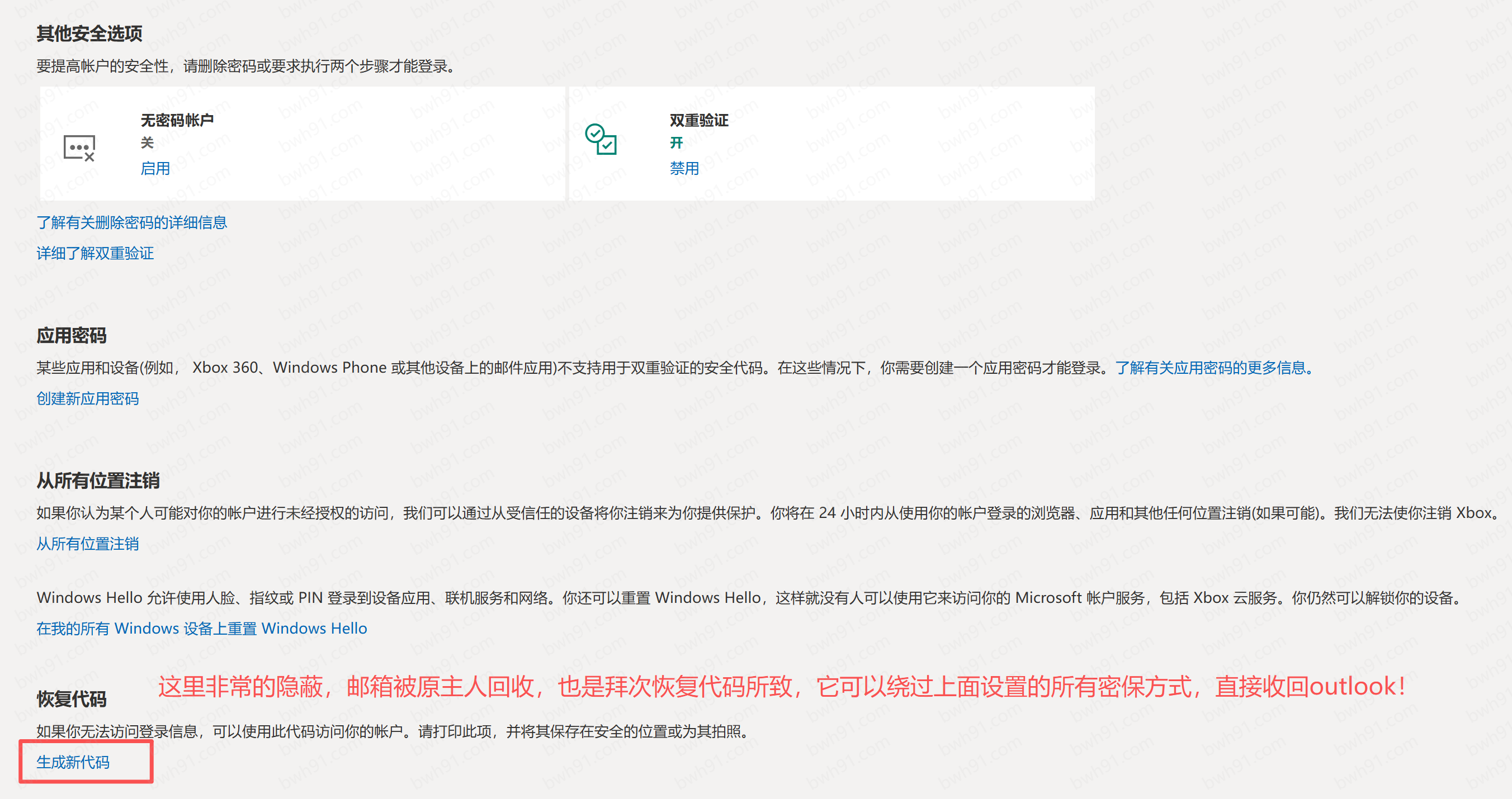这里非常的隐蔽,邮箱被原主人回收,也是拜次恢复代码所致它可以绕过上面设置的所有密保方式,直接收回outlook!