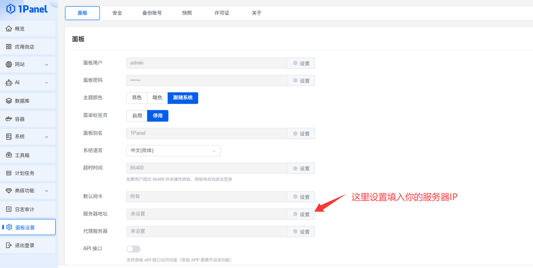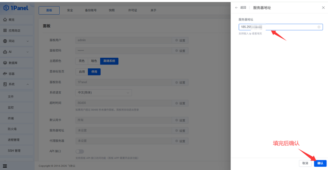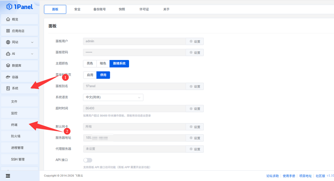 提示:设置好服务器地址不仅是为了使用终端,对于面板的安全验证和部分应用商店插件的正常运行也非常重要。