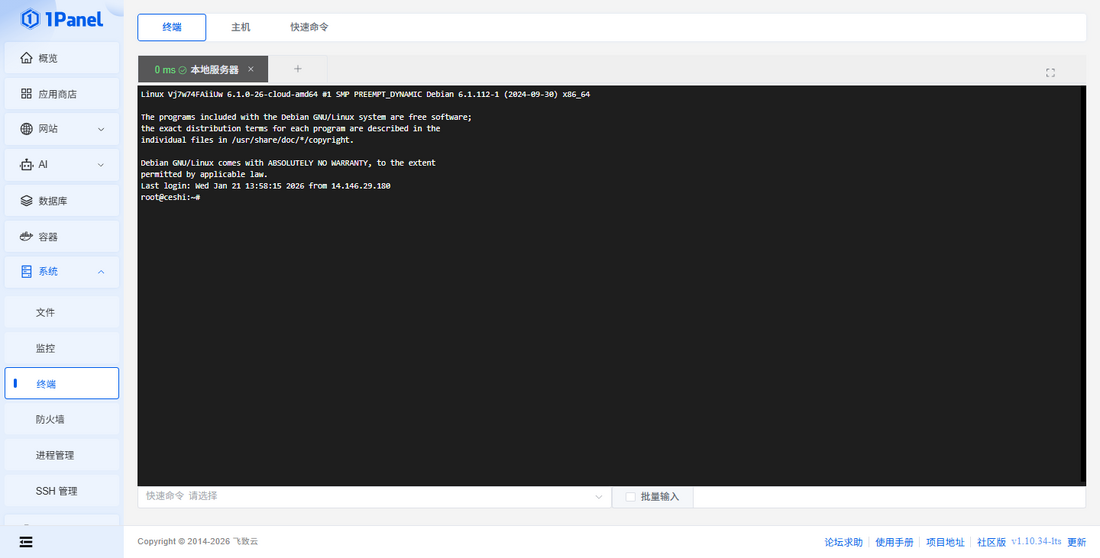 我们刚好前面已经在服务器上安装了1Panel面板(安装方法),面板里自带了一个非常实用的 网页终端 功能。它支持复制粘贴、多标签页管理,体验丝毫不输本地客户端。