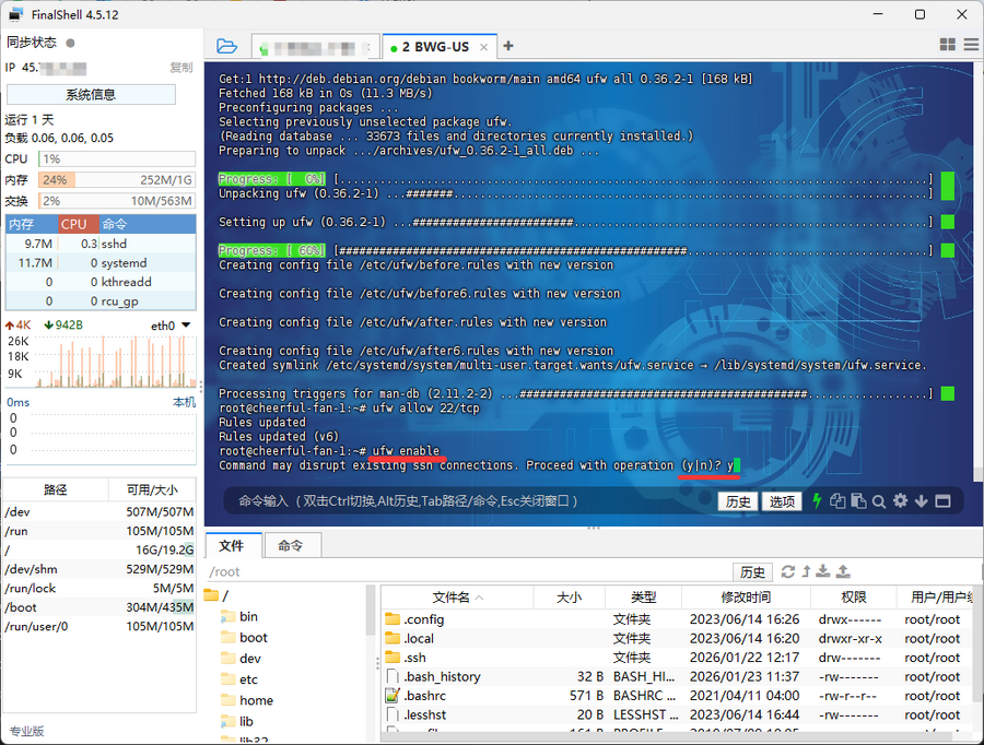 系统会提示可能会中断 SSH 连接,输入 y 并回车确认。