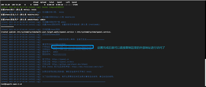 安装成功后,终端会显示你的 1Panel 登录信息,请务必将这些信息复制并保存下来!
