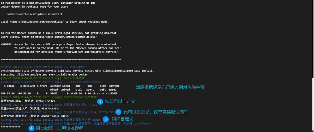 2. 配置面板端口、用户和密码: 安装程序会自动安装 Docker 和 Docker-Compose,然后会要求你设置面板的关键信息。
