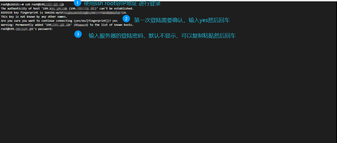 如果你是第一次登录这台服务器,系统会提示你一个关于主机指纹(fingerprint)的确认信息。这里直接输入 yes 然后按回车即可。