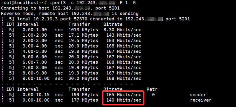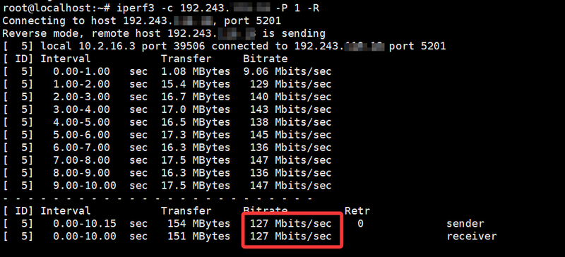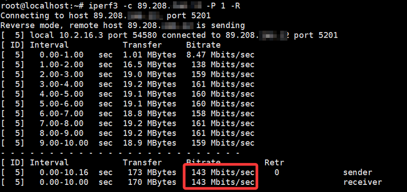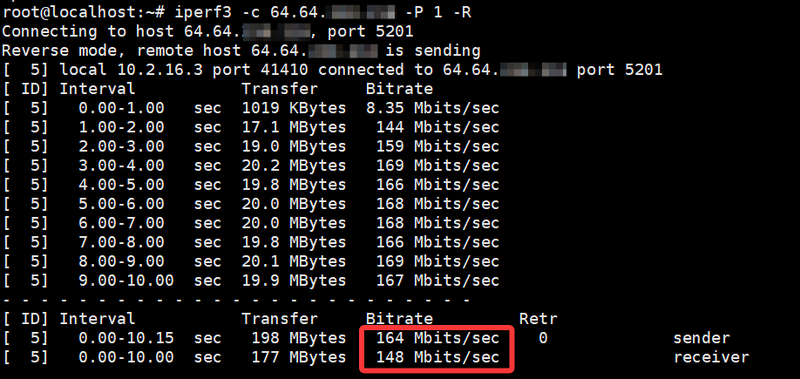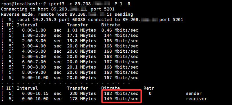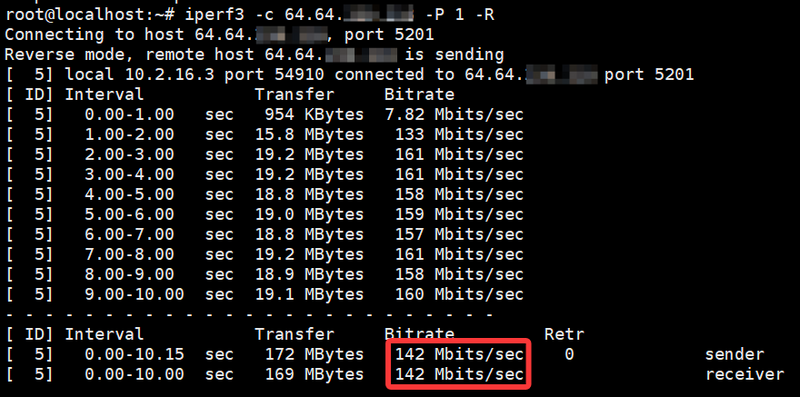 为了最直观地看到效果,避免其他不稳定因素干扰测试结果,我们使用网络测试工具 iperf3 ,让我们可以测试服务器到本地的单线程极限速度。