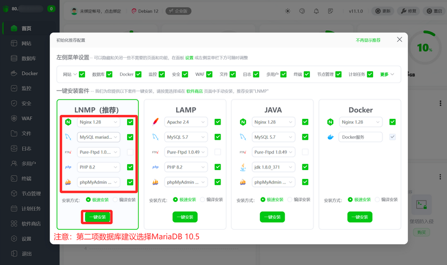 然后根据提示安装运行环境,大概1-2小时左右可以安装完毕,这里我们选择安装了LNMP环境,即Nginx+Mysql+PHP。