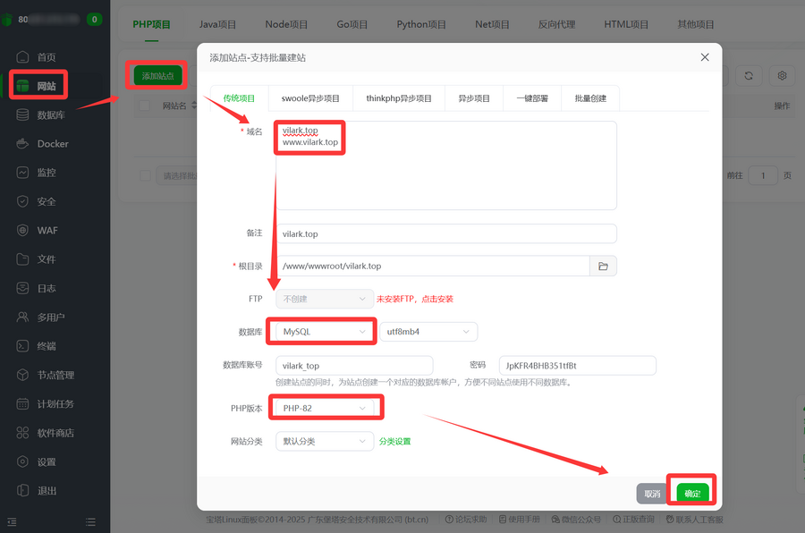 - 数据库: 并妥善保存生成的数据库名、用户名和密码。这是 WordPress 安装的关键凭证,请务必将其保存好。