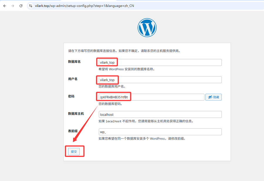 - 数据库连接信息: 按照图提示输入你之前保存的数据库名、用户名和密码,并提交。