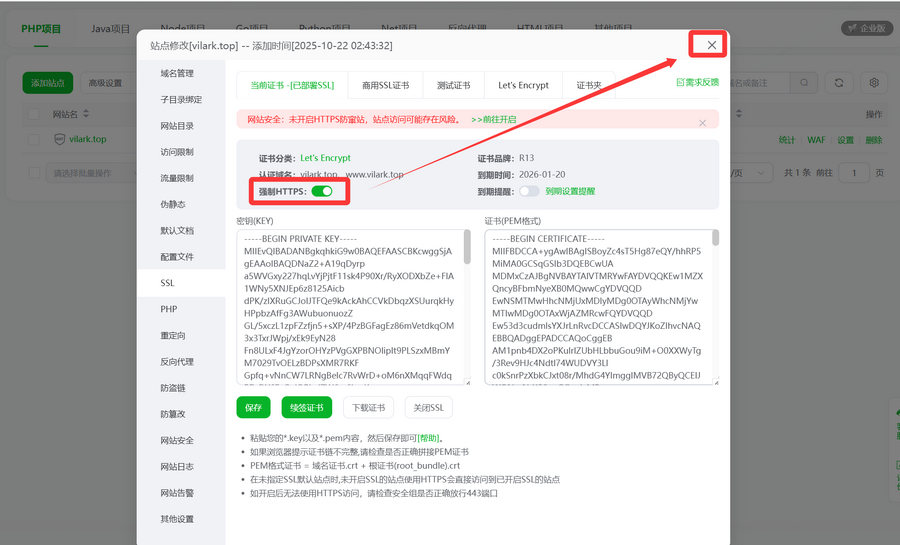 根据操作,申请免费SSL证书,并开启强制HTTPS,保证网站安全。