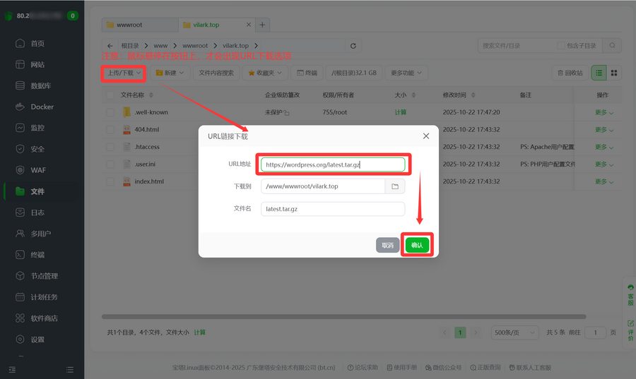 点击进入网站的根目录,然后点击左上角的URL链接下载,输入下方链接,下载Wordpress的安装包。