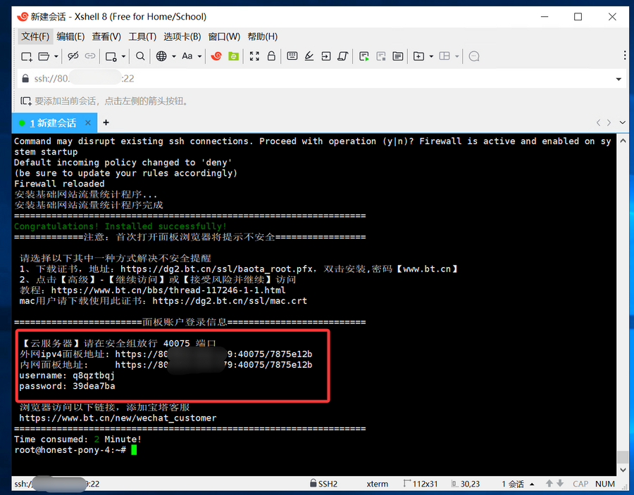 4.已使用SSH工具连接到搬瓦工的服务器(参考教程,含宝塔面板安装)。