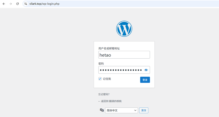 然后我们登录网站后台,网站后台登录地址默认为你的域名后加上 “/wp-admin”(例如:vilark.top/wp-admin)。