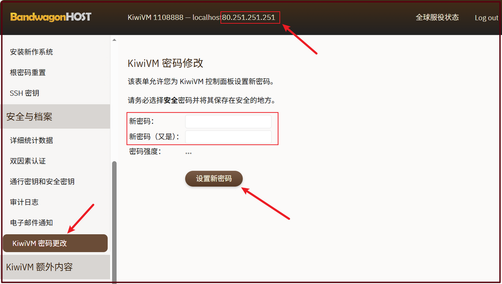 登录后,在左侧菜单中找到 KiwiVM 更改密码,右侧设置新的登录密码。 KiwiVM 登录账号为你的 VPS IP 地址,密码为你刚设置的密码。