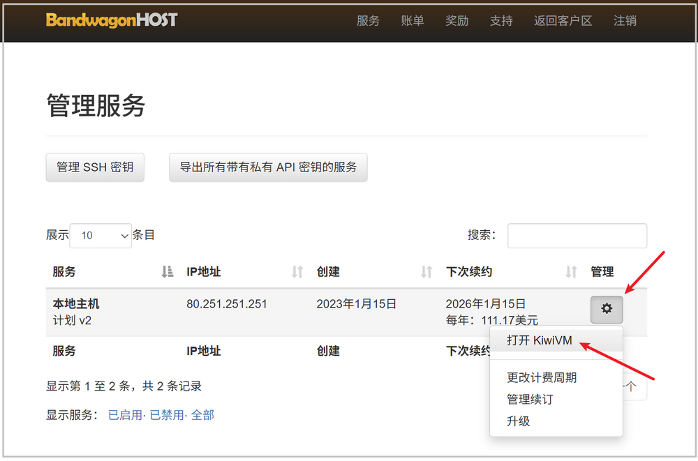 找到对应的 VPS 服务,在“管理”下点击齿轮图标,并选择 打开 KiwiVM 即可免密进入 KiwiVM 面板。