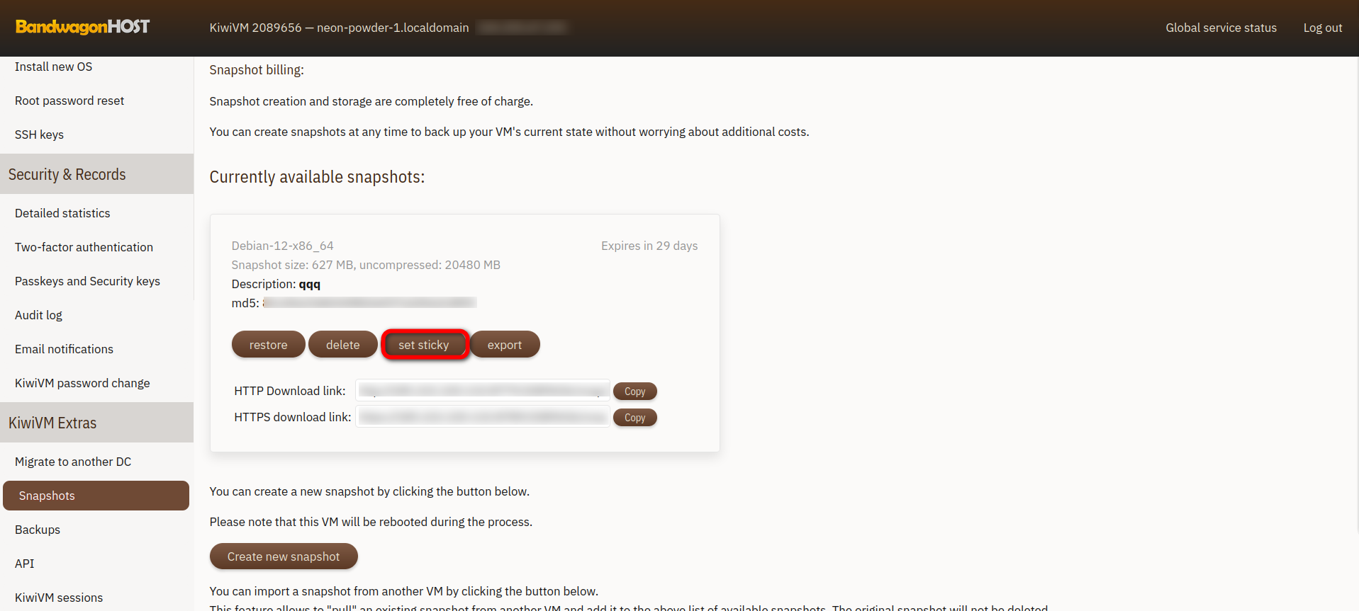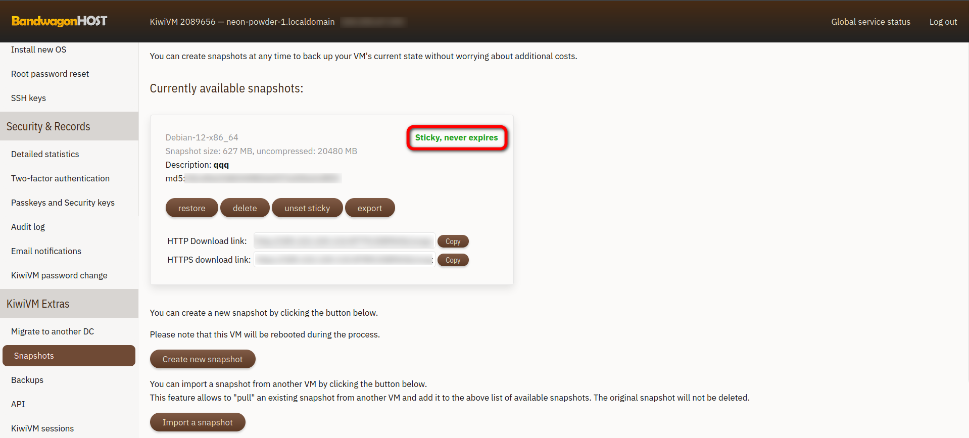 - 可以点击 Export 把快照下载到本地保存,或 Import 其他 VM 的快照。