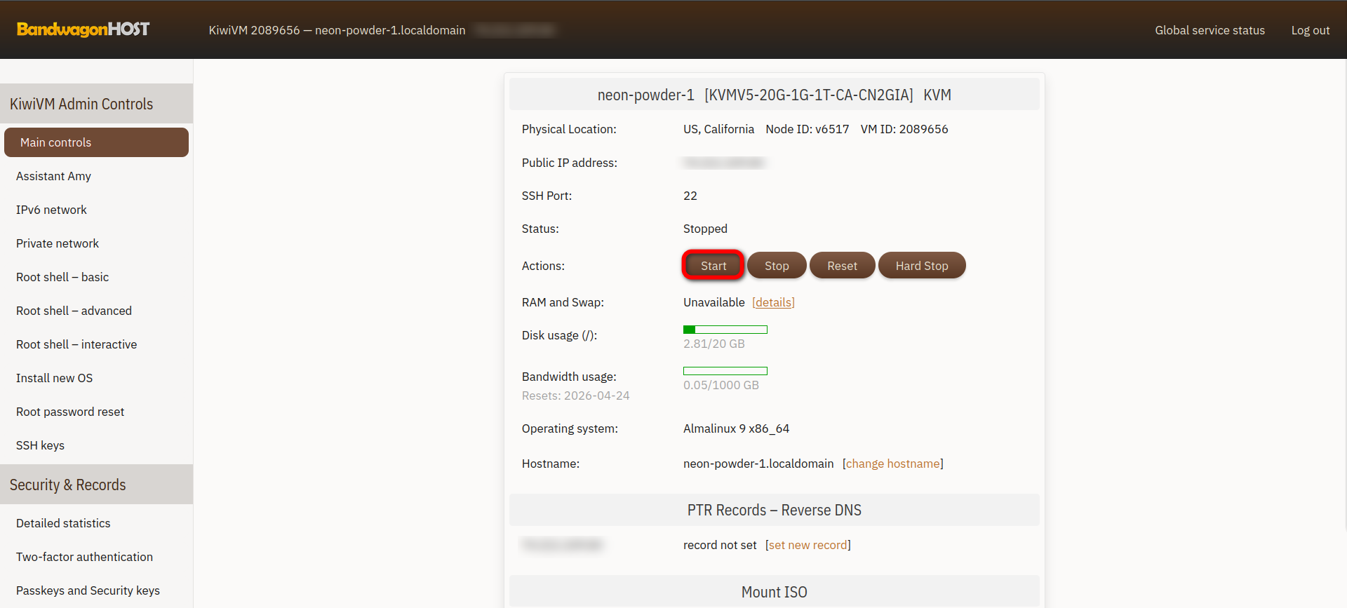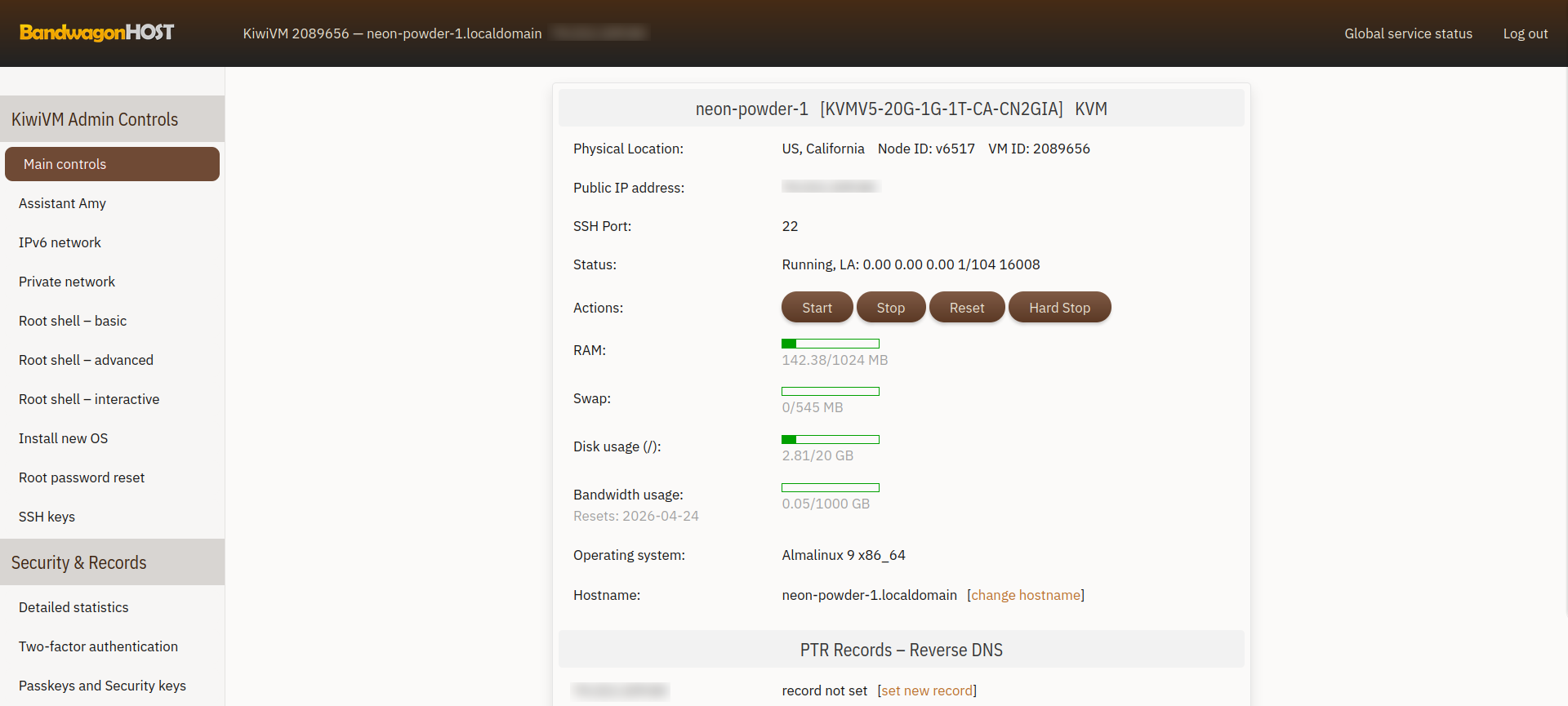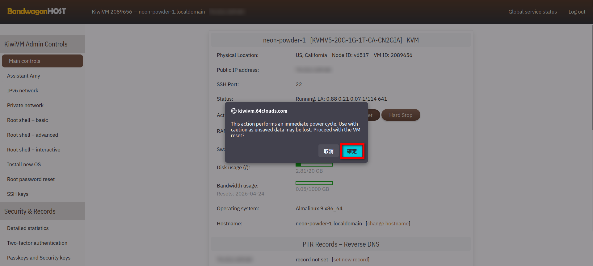 3. 新标签页打开后就是 KiwiVM 主界面(Main controls)。左侧菜单有 Main controls、安全记录等,右侧显示节点、公网 IP、SSH 端口、资源使用情况。