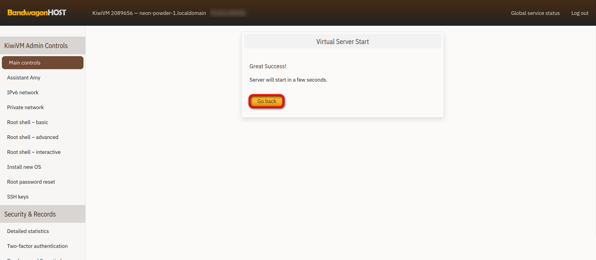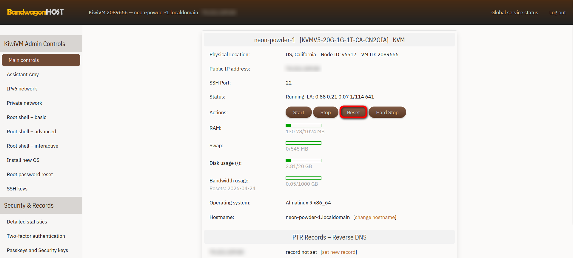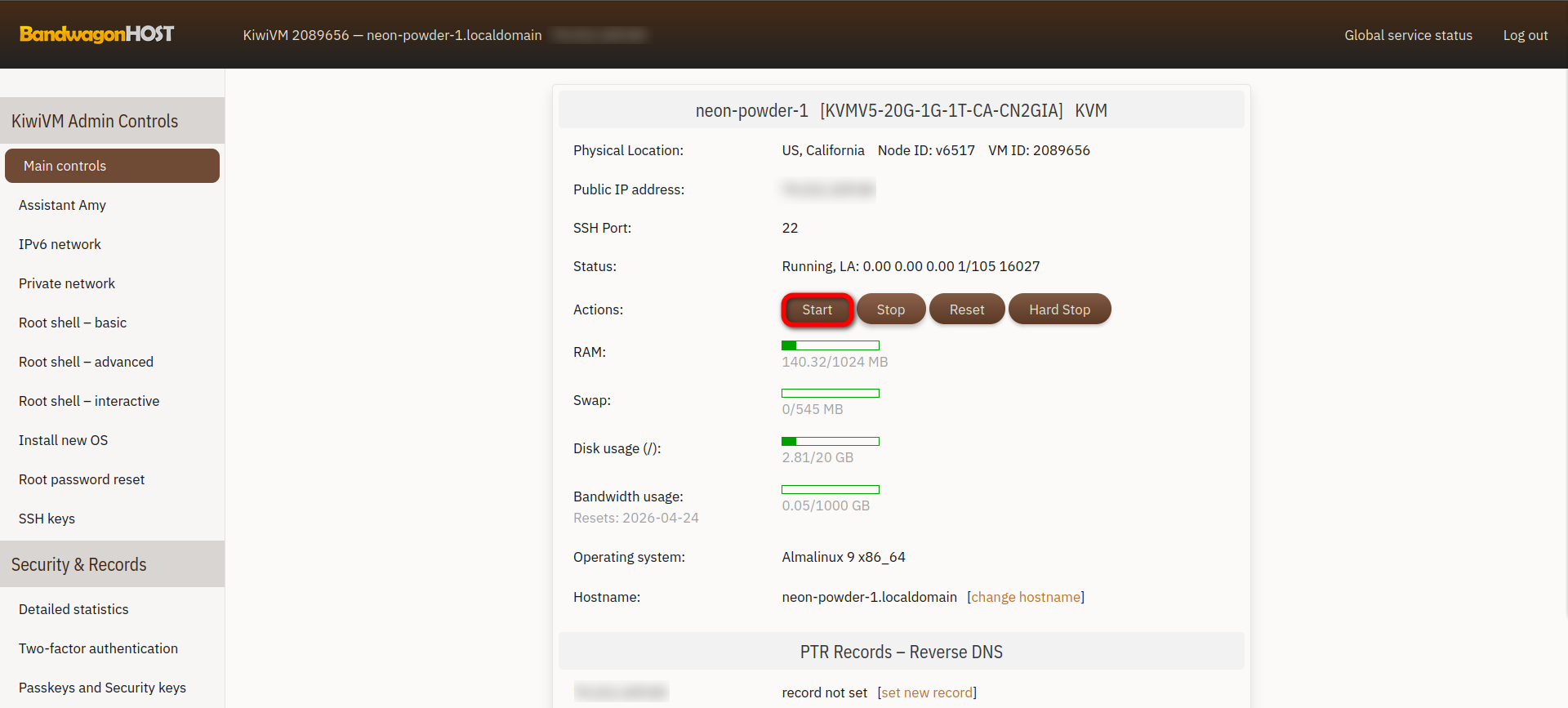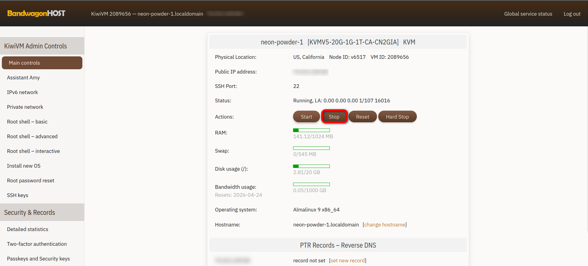 3. 新标签页打开后就是 KiwiVM 主界面(Main controls)。左侧菜单有 Main controls、安全记录等,右侧显示节点、公网 IP、SSH 端口、资源使用情况。