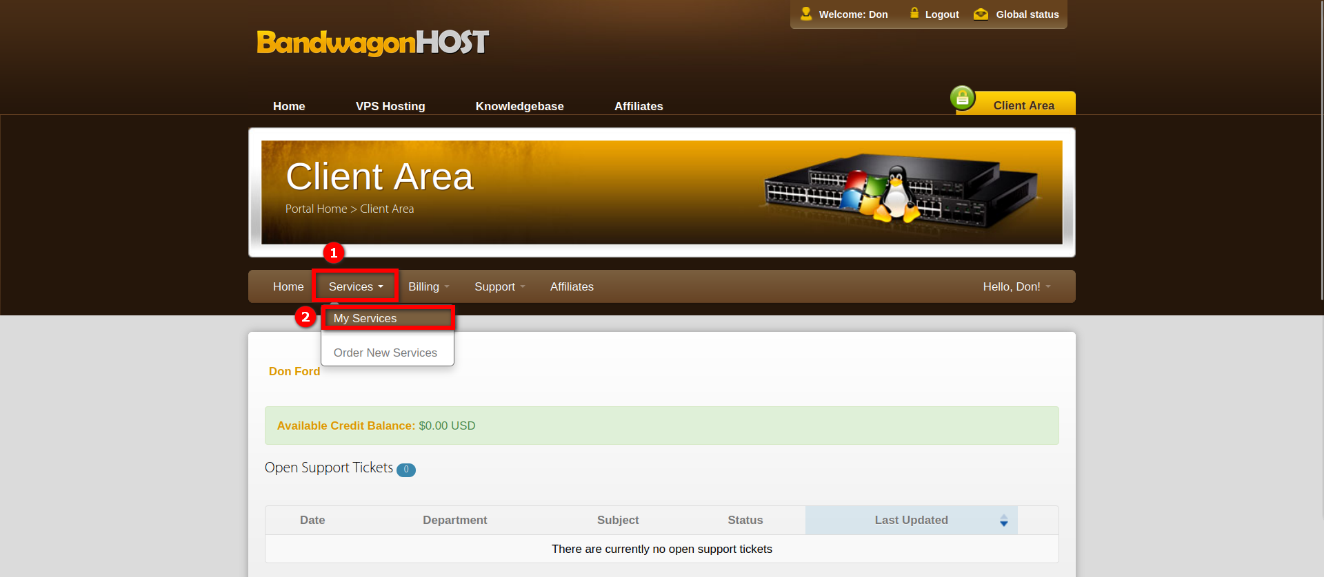 1. 登录搬瓦工官网客户后台(Client Area)。顶部导航栏点击 Services → 下拉菜单选 My Services。