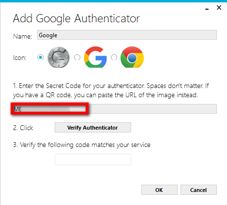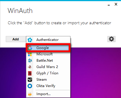 3. WinAuth 添加 Google 类型,输入 Secret Code,也就是第1步中Key后面的那一串字母。