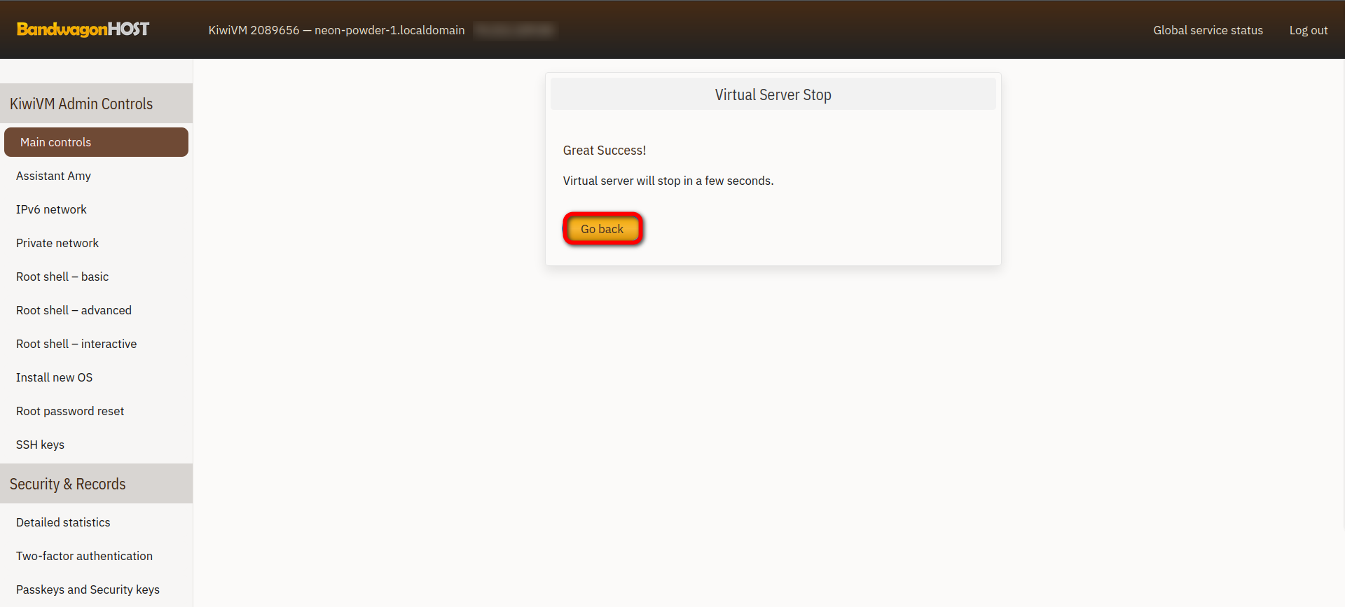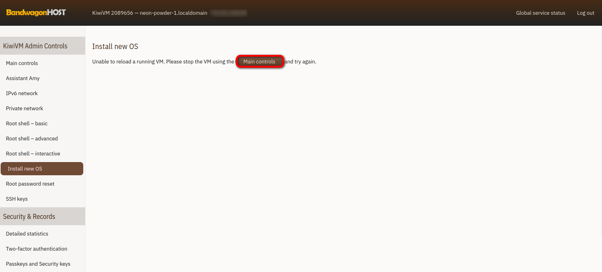 下面详细讲解 KiwiVM 最基础的开关机操作,重装、恢复快照、迁移都必须在 Stopped 状态下进行,否则会报错。