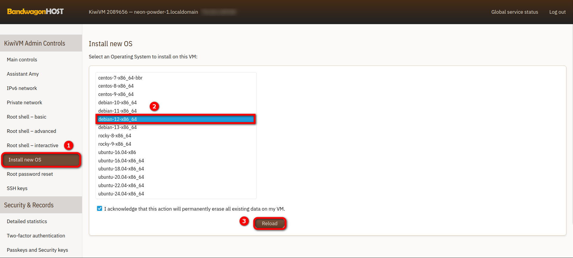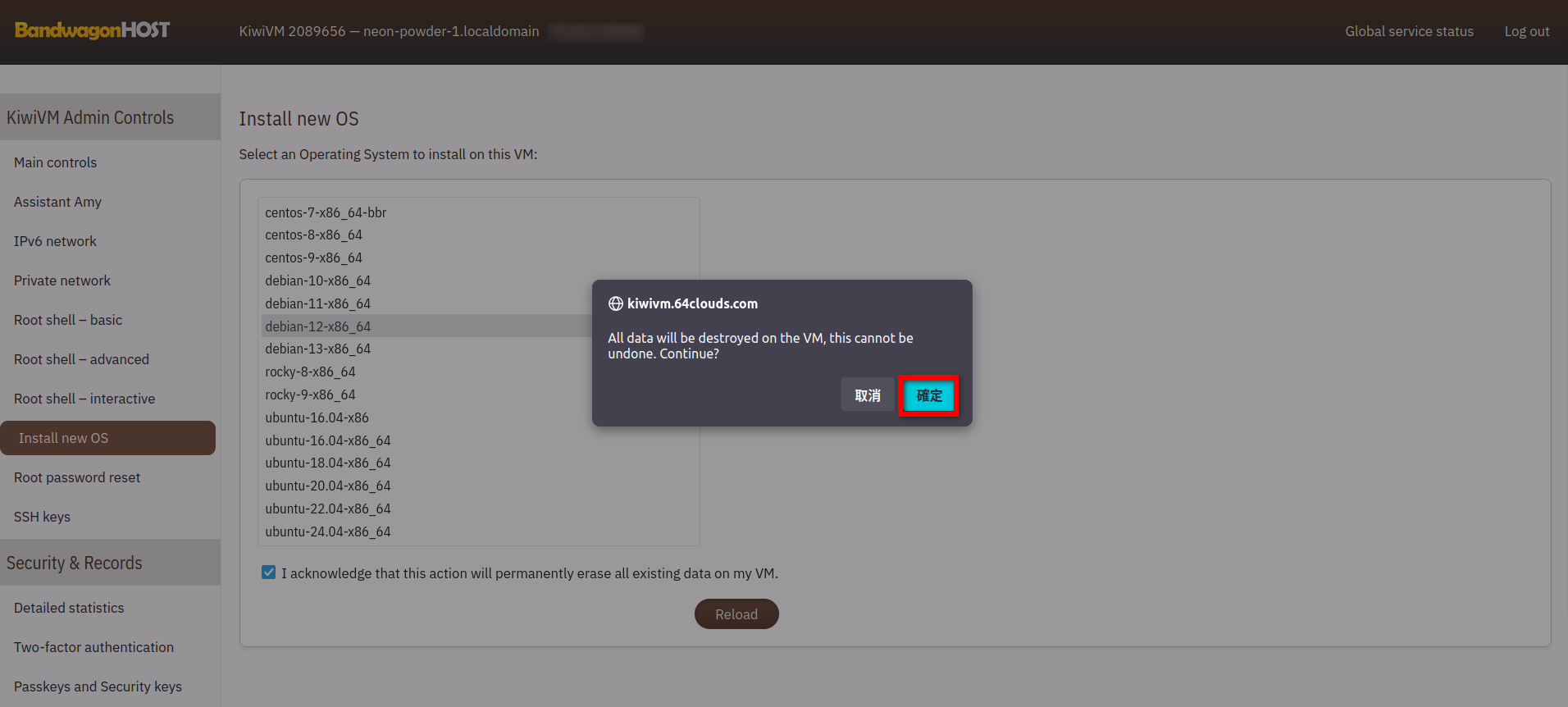 2. 左侧菜单点击 Install new OS。选择 debian-12-x86_64(或其他需要的系统),勾选“I acknowledge that this action will permanently erase all existing data”。
