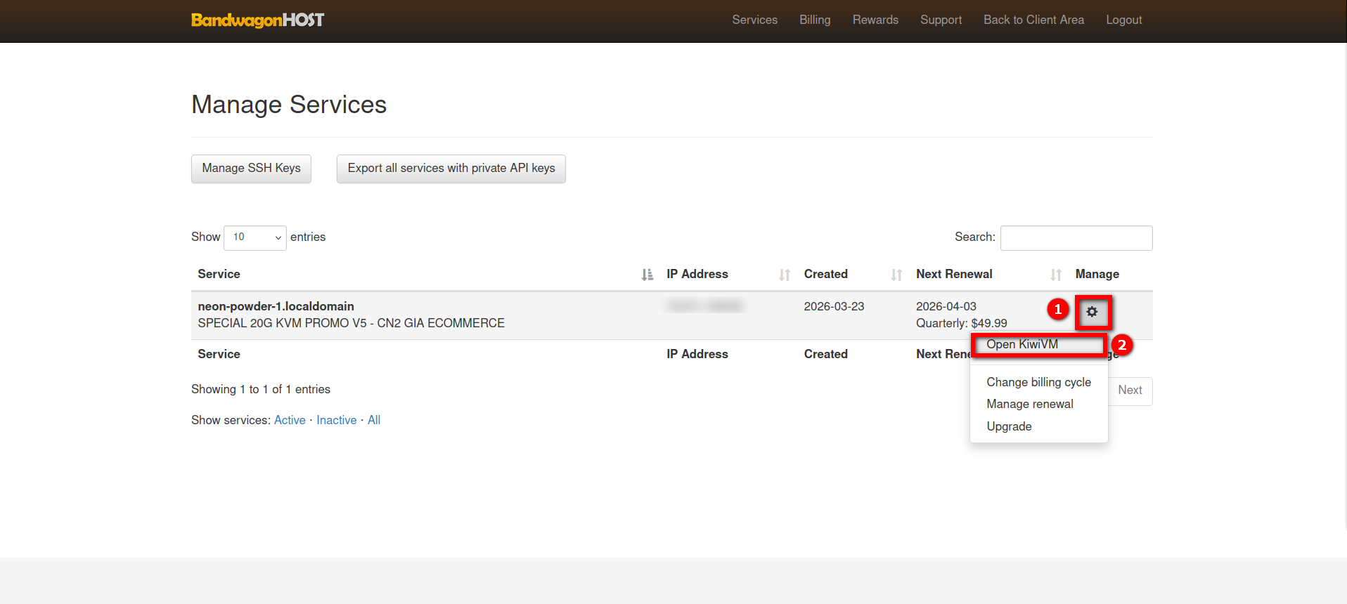 2. 找到VPS,右侧点击齿轮 Manage 按钮 → 弹出菜单选 Open KiwiVM。
