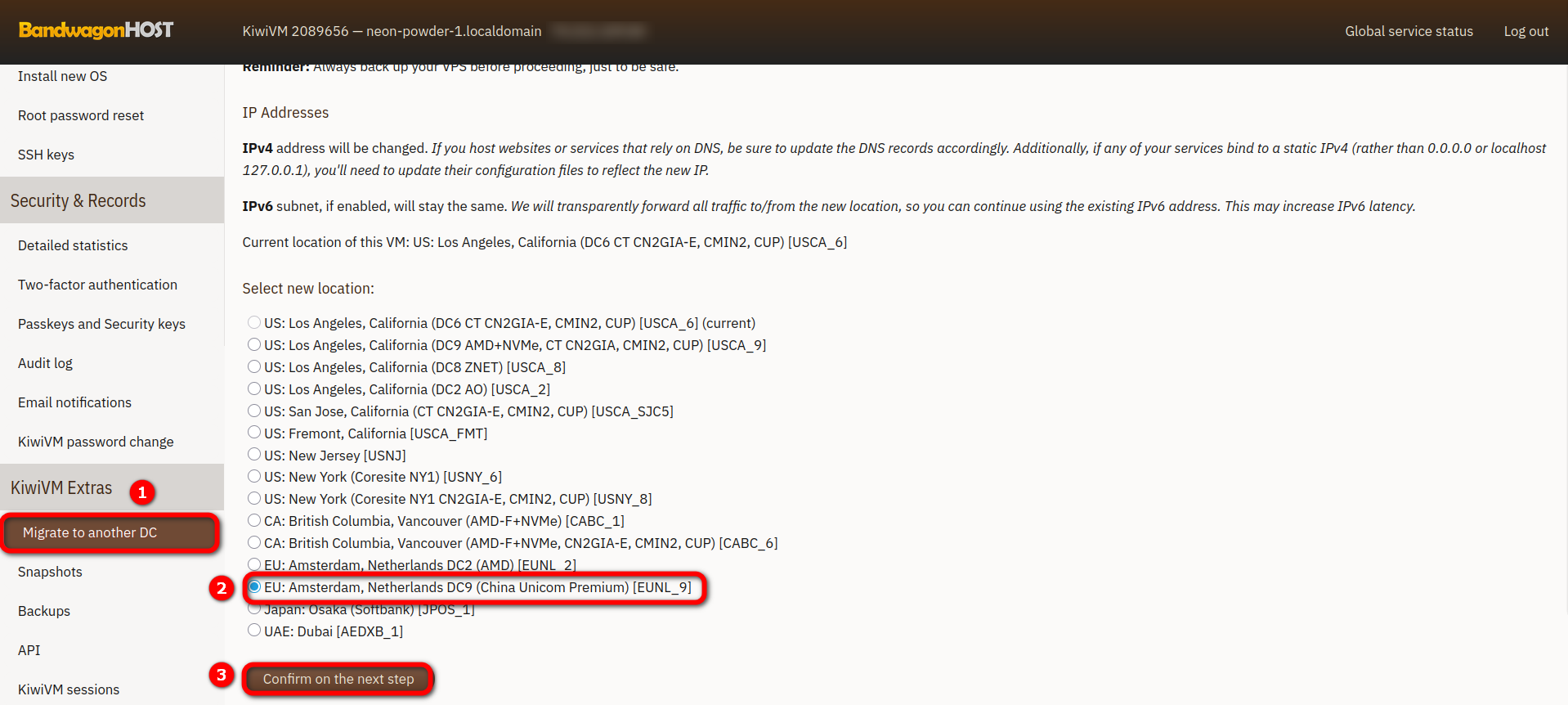 1. 左侧 Migrate to another DC,选择目标节点(如 EU Amsterdam DC9 China Unicom Premium),点击 Confirm on the next step。